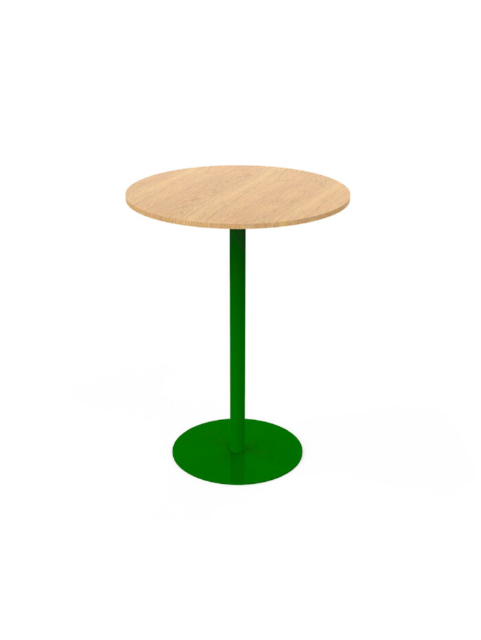 Su estructura se compone de un tablero redondo fabricado en melamina, que destaca por su acabado liso y refinado, mientras que una base circular metálica garantiza estabilidad y equilibrio. Ambas partes están conectadas por una columna cilíndrica central de metal, lo que refuerza su durabilidad y resistencia. Esta pieza no solo cumple una función práctica, sino que también aporta un toque sofisticado y contemporáneo, ideal para adaptarse a una variedad de entornos como bares, cafeterías o interiores de diseño moderno.